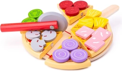 A fa vágós pizza ideális játék a kreatív szerepjátékhoz. A gyerekek „süthetnek”, szeletelhetnek és tálalhatnak, gombával, hagymával, paprikával vagy szalámival díszíthetik a pizzát, miközben kéz-szem koordinációjukat gyakorolják. A törteket jelölő alátét játékosan segít megérteni az olyan fogalmakat, mint az 1/2, 1/3 vagy 1/6.