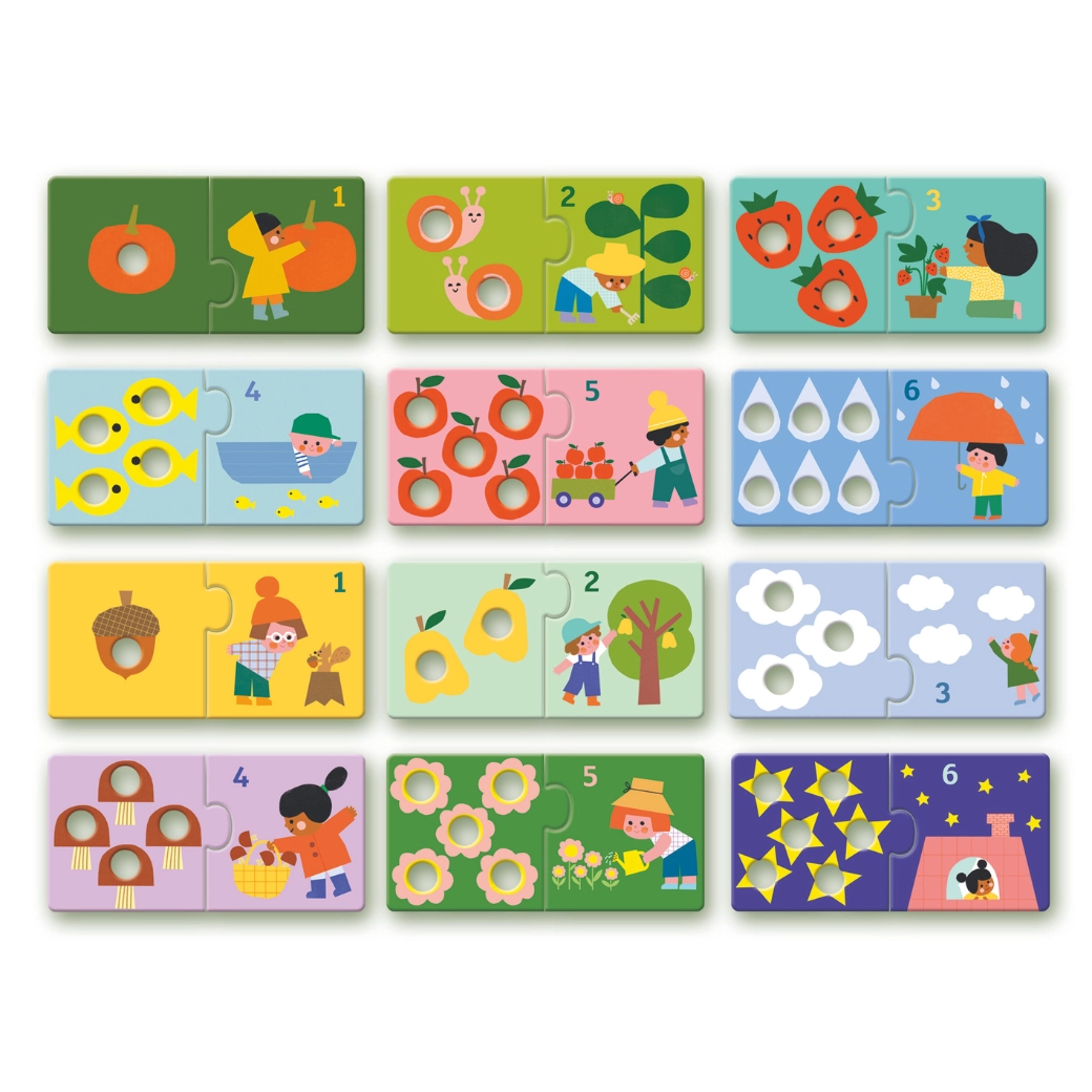 Tanítsd meg a gyerekeknek a számokat játékos formában a Djeco Duo Puzzle Első számok segítségével. A párok a mennyiség és a számjegy alapján illeszkednek, ami fejleszti a logikus gondolkodást, a finommotorikát és a korai matematikai műveltséget. Ideális az első ismerkedéshez a számokkal szórakoztató és érthető módon.