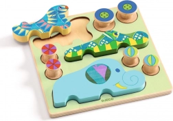 Fedezze fel a Djeco márka játékos, állatos kisautós bedugós puzzle-jét. Az elemek a gyerekkezekhez igazodnak, sima élekkel és vonzó színekkel, amelyek támogatják az alak- és színfelismerést. A darabok helyes behelyezése után a puzzle „elindulhat”, ami további szórakozást nyújt.