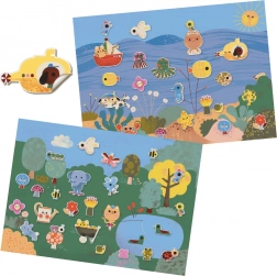 Ez a kreatív készlet két illusztrált hátteret kínál – a víz alatti világot és az erdőt tavacskával – valamint egy ív bájos matricát halakkal, rákkal, tengeralattjáróval, csónakkal, erdei állatokkal és sok más motívummal. A gyerekek tetszés szerint áthelyezhetik a matricákat, és újabbnál újabb történeteket találhatnak ki.