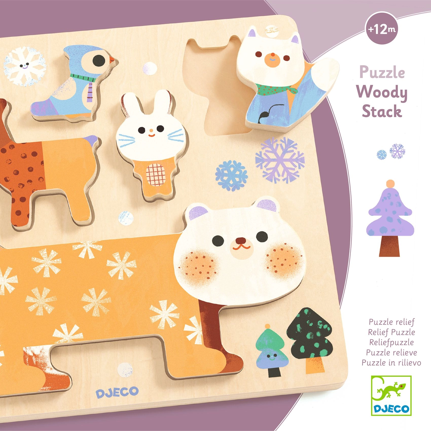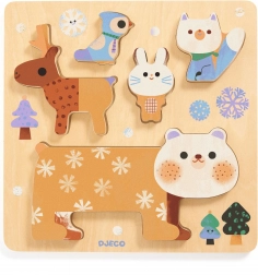 Ez a szett a klasszikus betétes fa kirakót ötvözi egy egyensúlyozó toronnyal. A vidám állatok – medve, nyuszi, madár, őz és bagoly – a formájuk szerint a táblába illeszthetők, vagy toronnyá rakhatók az egyensúly gyakorlásához. A játék segít fejleszteni a türelmet és a térbeli észlelést.