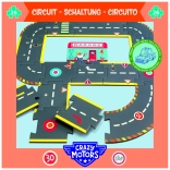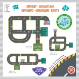 Ez a nagyméretű úthálózat-kirakó végtelen lehetőséget kínál a kedvenc kisautók pályáinak építéséhez. A puzzle formának köszönhetően az elemek pontosan illeszkednek, és teljes utcahálózatot hoznak létre kereszteződésekkel, kanyarokkal és parkolózónával. A közlekedési elemeket ábrázoló minőségi nyomat természetes módon segíti a közlekedési táblák és szabályok megismerését.