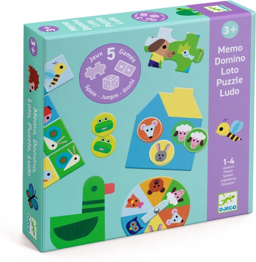 Ez a szépen illusztrált DJECO szett öt közkedvelt játékot hoz egy dobozban – tökéletes választás első társasjátékoknak. A gyerekek gyakorolják a színeket, formákat, számolást és a memóriát, miközben aranyos farmállatokkal szórakoznak.