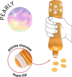 A gyöngyházas fényű DJECO habfilctollakat a kis művészek számára tervezték. A széles, habos hegynek köszönhetően a szín egyenletesen kerül fel, nem csöpög, és könnyen lemosható a bőrről és a legtöbb textíliáról. A finom gyöngyházhatás varázslatos csillogást ad minden rajznak.