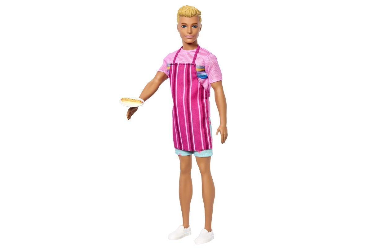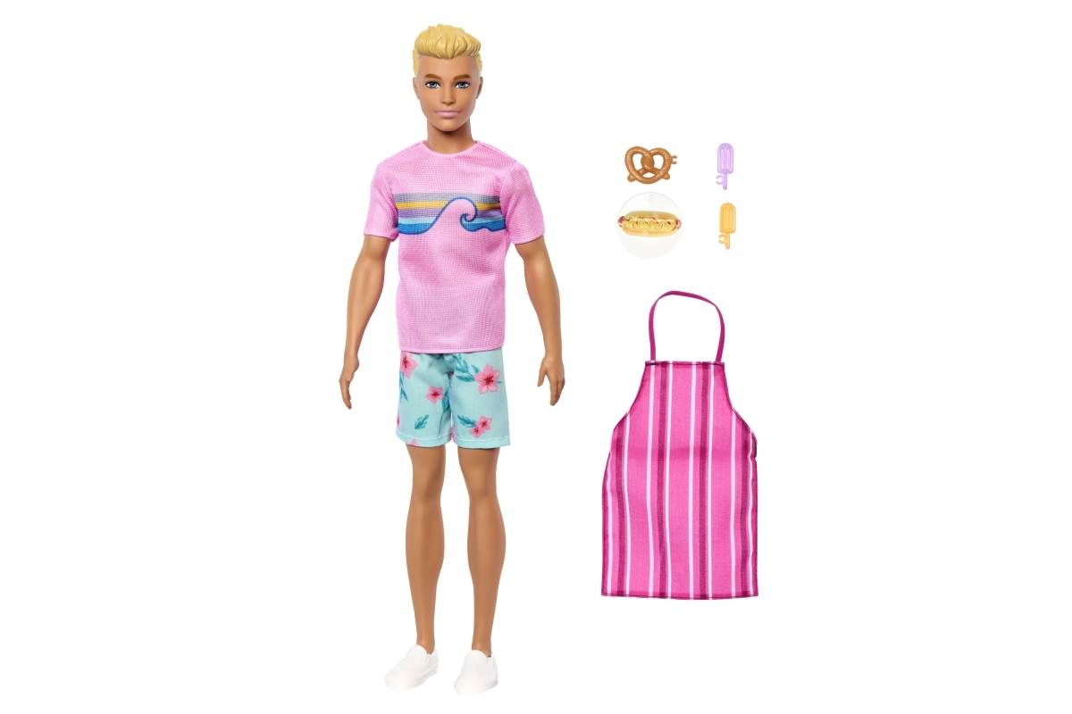 - Ken baba, rózsaszín póló, virágmintás rövidnadrág, fehér cipő, csíkos kötény, perec, hot dog, 2× jégkrém