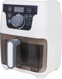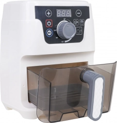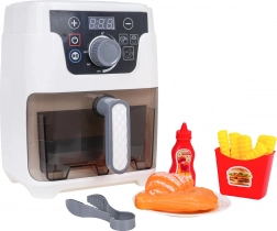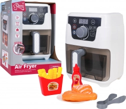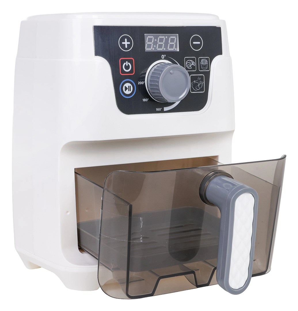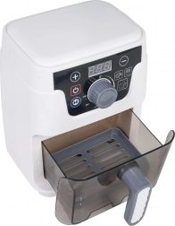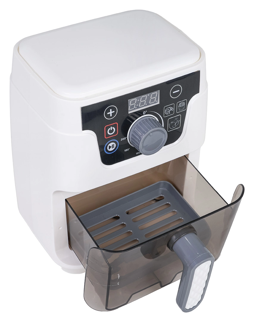 Ez a részletgazdag gyerek légsütő úgy néz ki és úgy viselkedik, mint egy valódi készülék: megvilágított kosárral, digitális kijelzővel és hangokkal a sütéshez, pirításhoz, valamint a fiók nyitásához/zárásához. Az automatikus programok megjelenítik az időt a kijelzőn (kifli 2:50, hasábburgonya 2:00, csirke 3:00), és a ciklus befejezésekor a készülék hangjelzéssel együtt automatikusan kikapcsol.