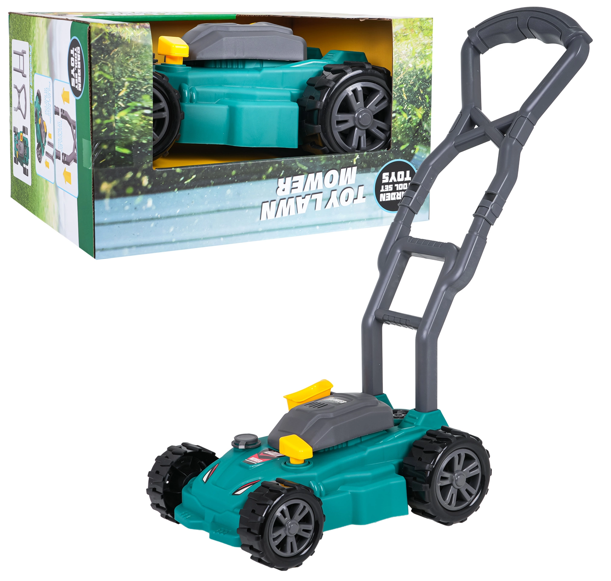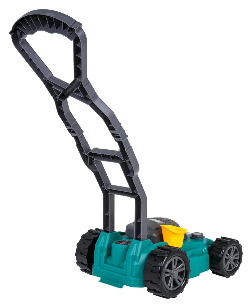 A fűnyíró biztonságos kültéri és beltéri szórakozáshoz is ideális. Az összeszerelés gyors – csak csatlakoztassa a fogantyút, és helyezze be a 2× AA 1,5 V elemet (nem része a csomagnak). A mintázott, masszív kerekek egyenletes mozgást biztosítanak különböző felületeken.