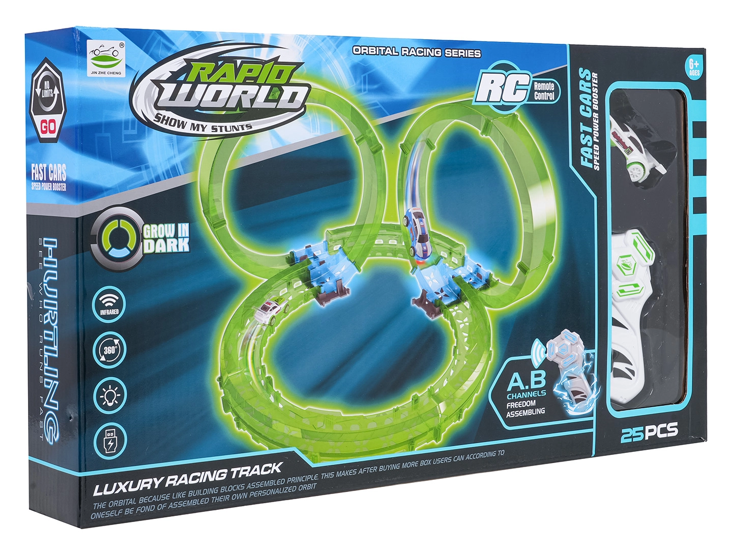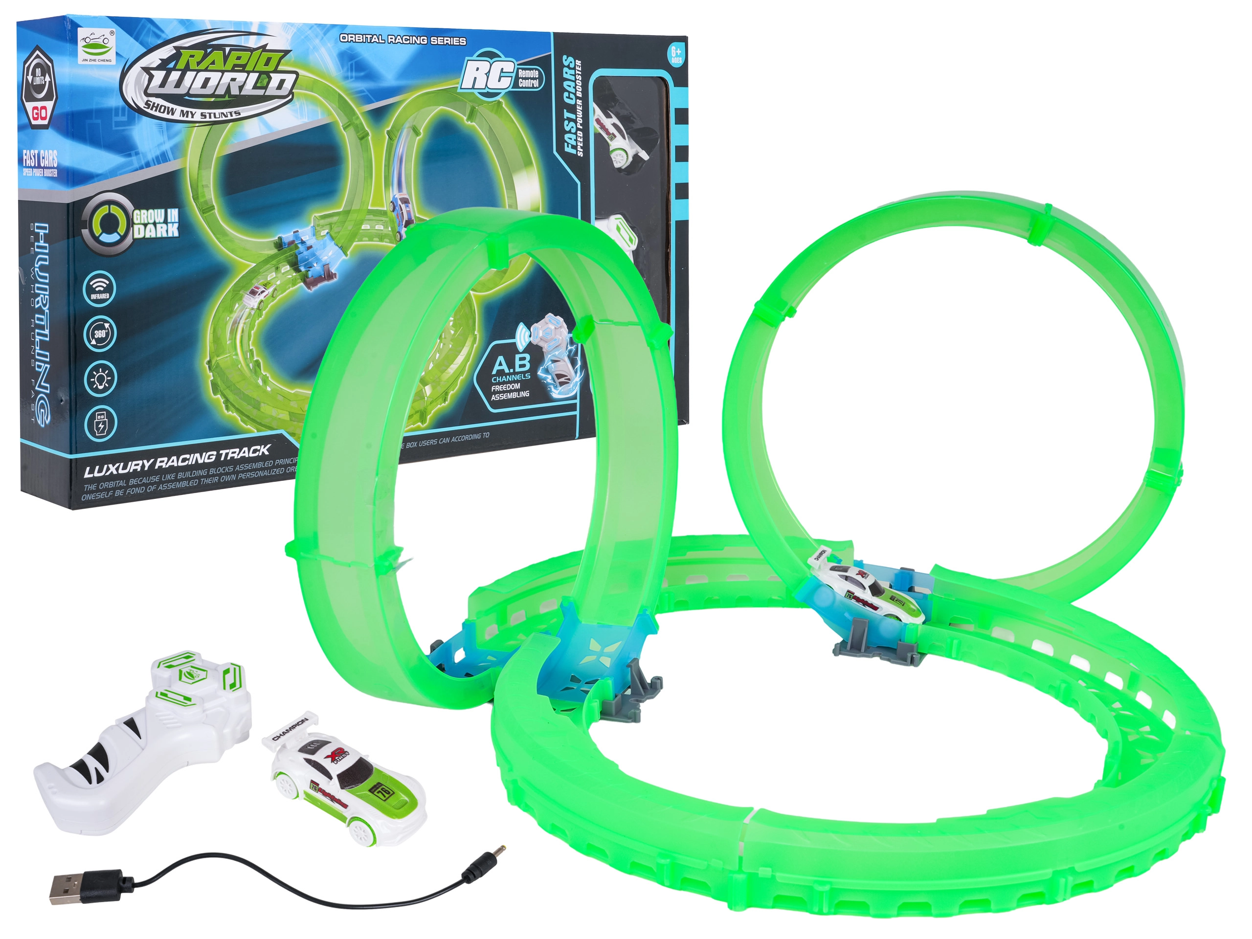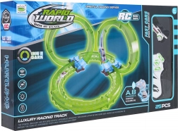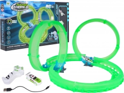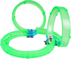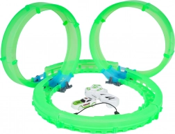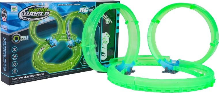 Ez a kompakt versenypálya világító, áttetsző elemekkel izgalmas vezetési élményt nyújt látványos fényhatásokkal. A LED-es autó a hurkokon és íveken száguldva fényes nyomot hagy a sötétben. A távirányítóval a sebesség és az irány mindig az Ön kezében van.