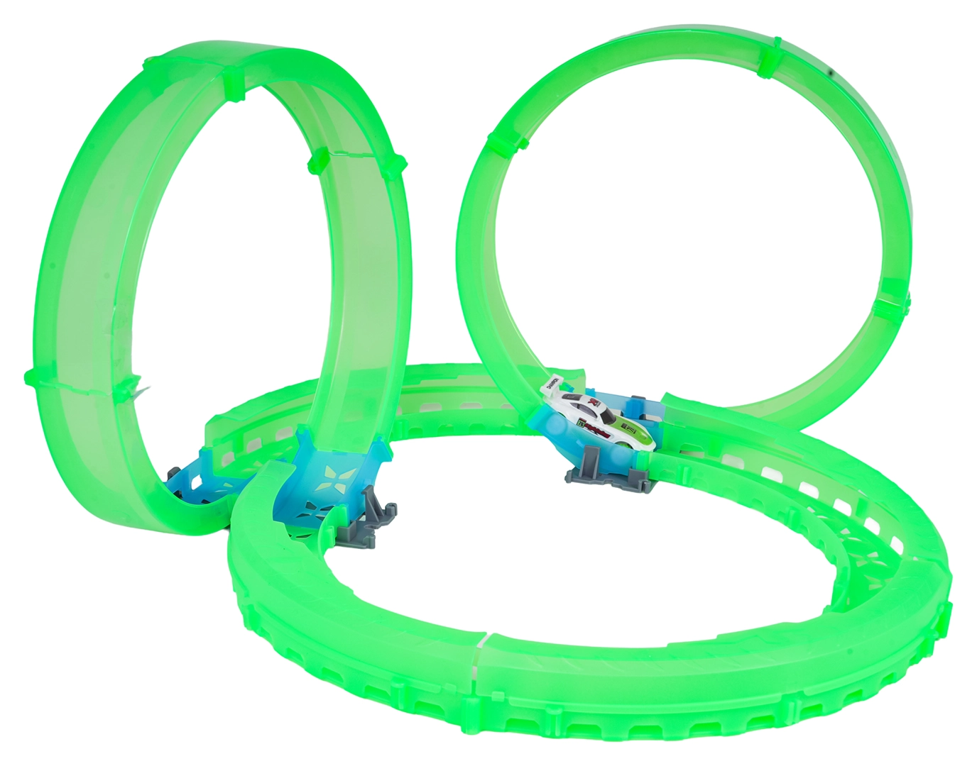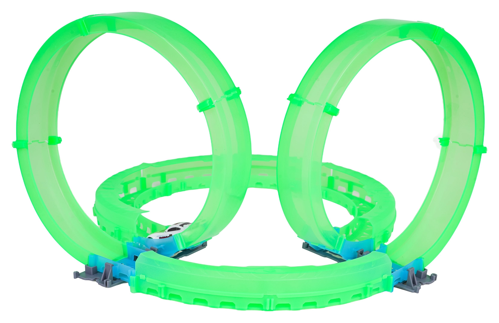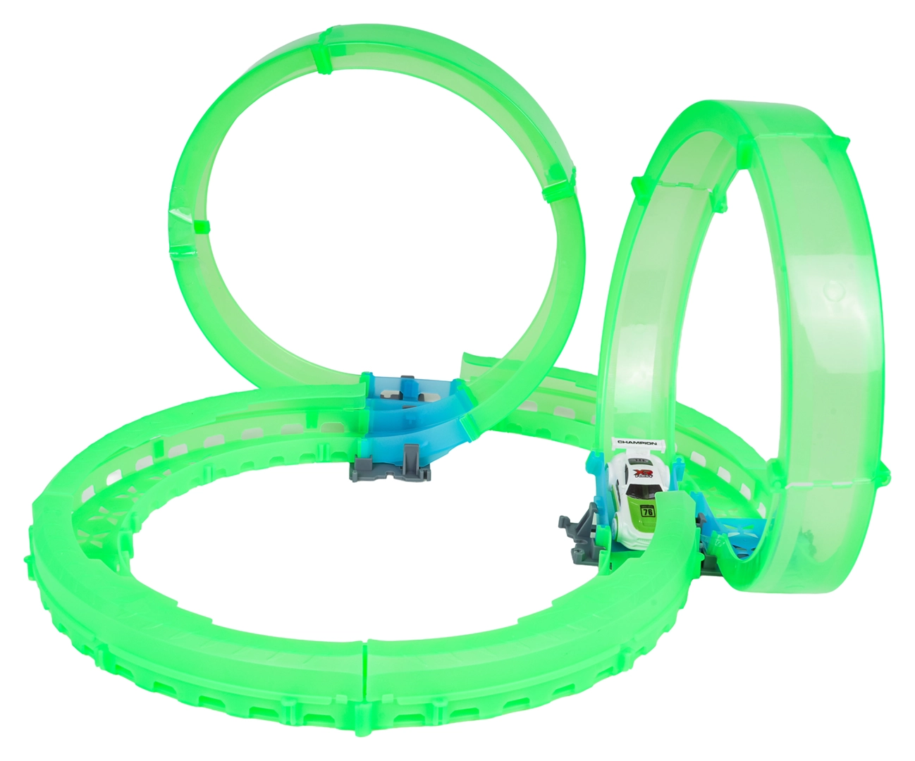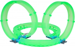 Az áttetsző pályaelemek sötétben ragyognak, és látványos, hurkokkal és kanyarokkal teli menetet tesznek lehetővé.
