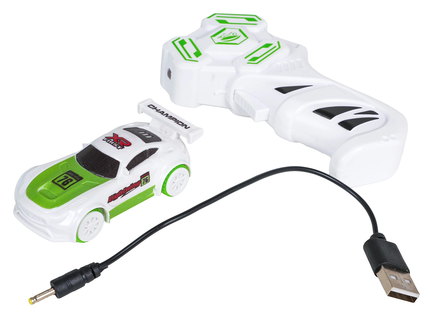 A kompakt versenyautót LED megvilágítással a mellékelt távirányítóval irányíthatja. A töltést a csomagban található USB kábel biztosítja.