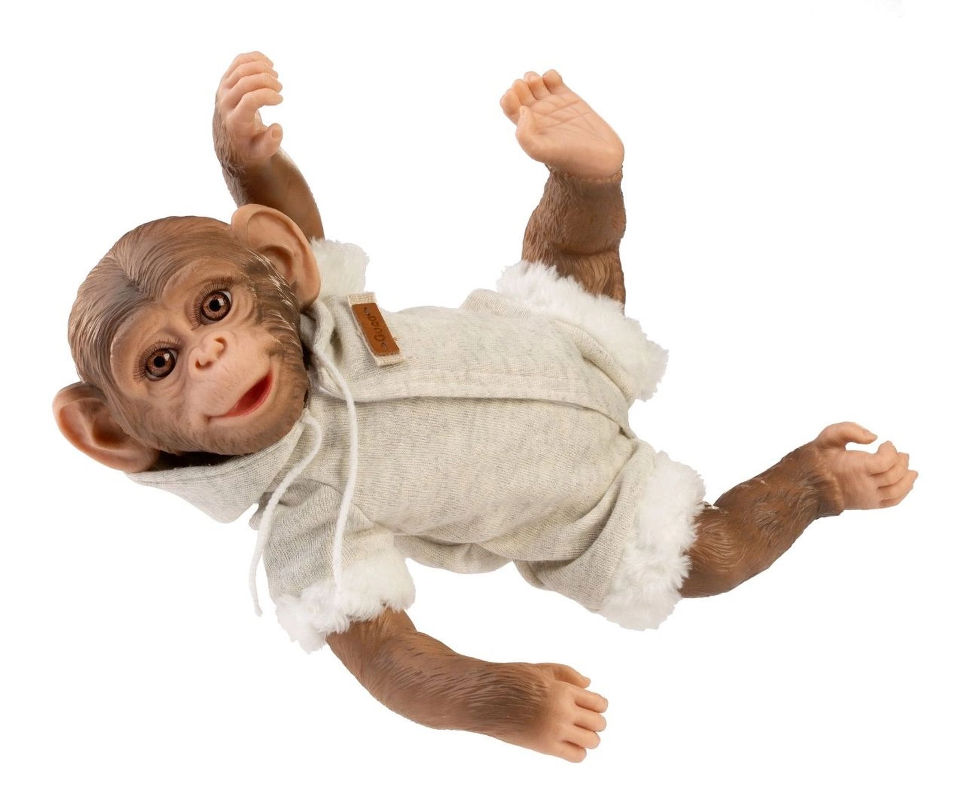 A zsinóros kapucni és a selymes plüss szegélyek otthonos, bájos megjelenést kölcsönöznek a REBORN majomnak – játékhoz és fotózáshoz egyaránt ideális.