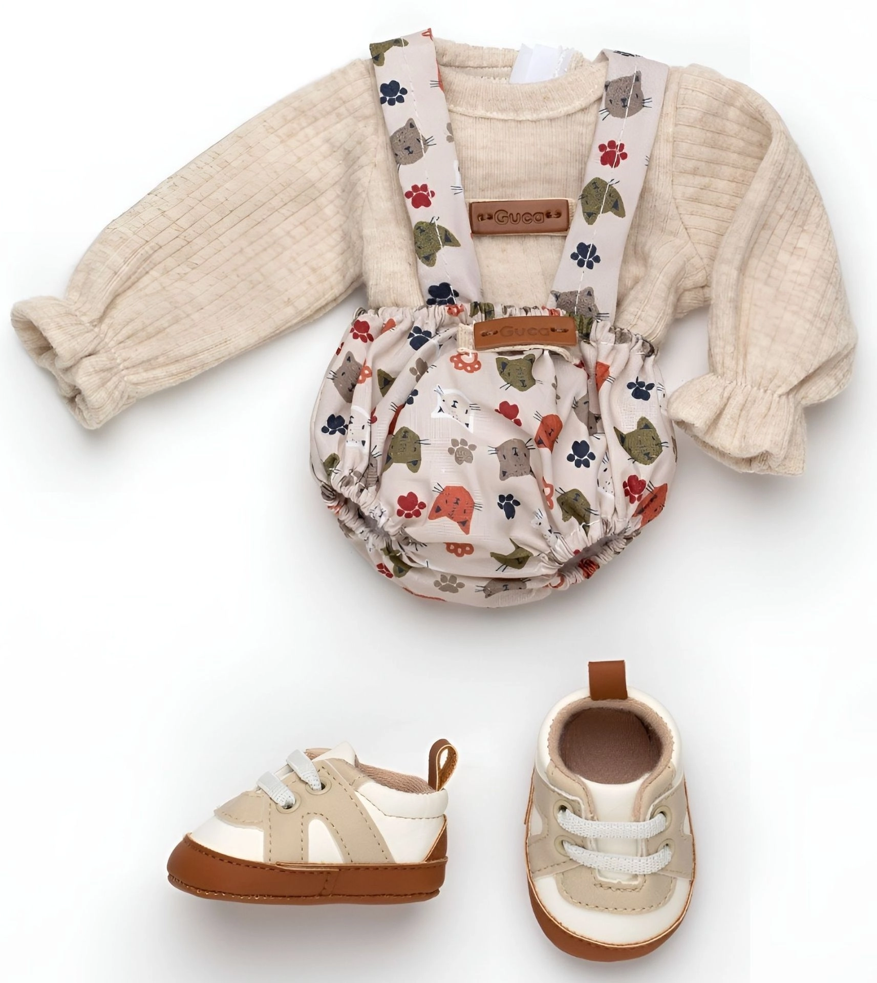 Cuki, 3 részes ruhaszett REBORN bébi majom számára, 32 cm-es méretben, stílusos darabokkal és kényelmes cipőcskékkel. Tökéletesen illeszkedik, kíméletes a gyerekek bőréhez, és ideális a kreatív játékhoz. Kézzel készül Spanyolországban, nagy hangsúllyal a minőségen és a részleteken. Teljes outfit, kézműves gyártás, puha anyagok, könnyű felöltöztetés.