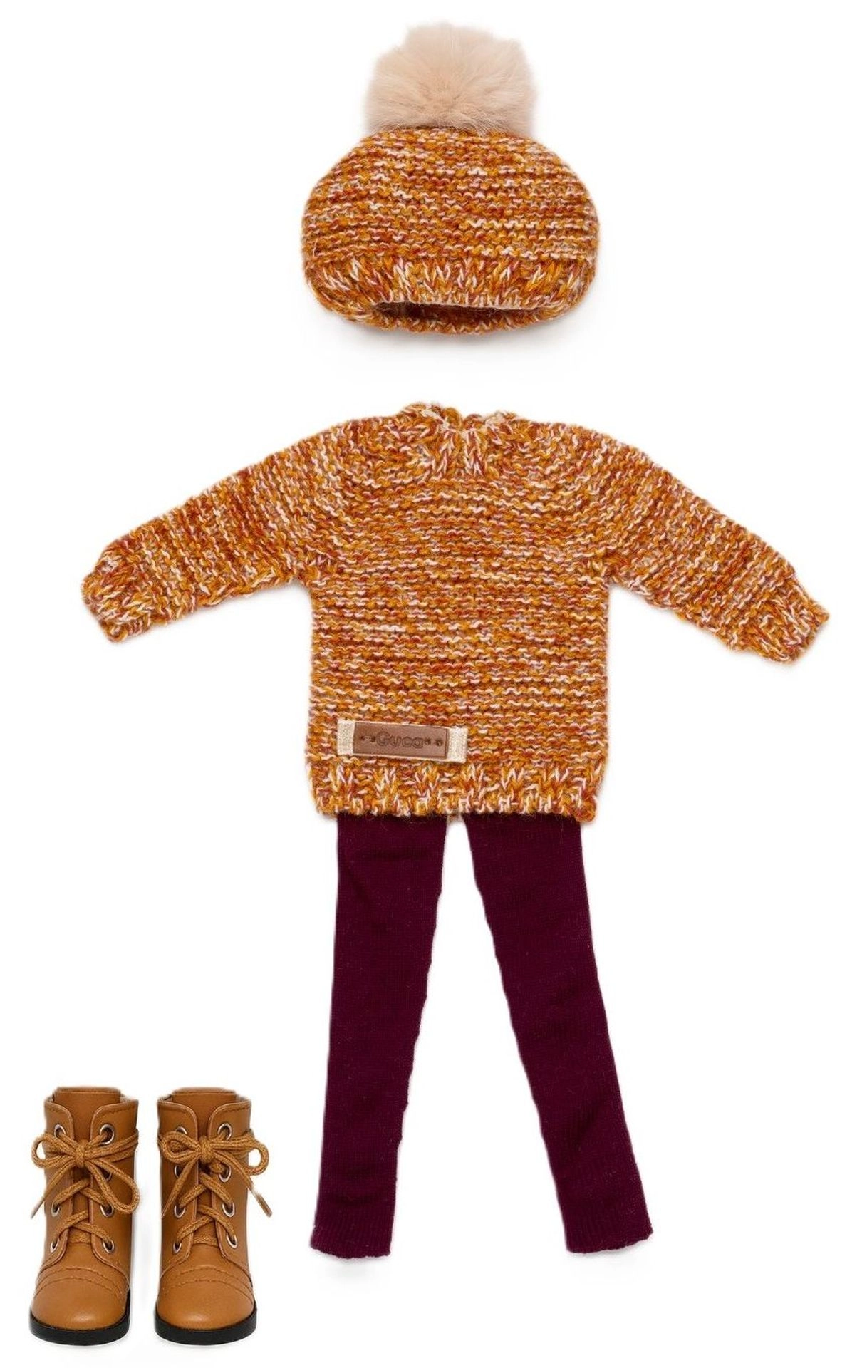 A pomponos sapkával párosított kardigán otthonos megjelenést ad, amely tökéletes őszre és télre. Kellemes anyagok a kényelmes öltöztetésért és a hosszan tartó játékért.
