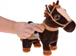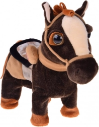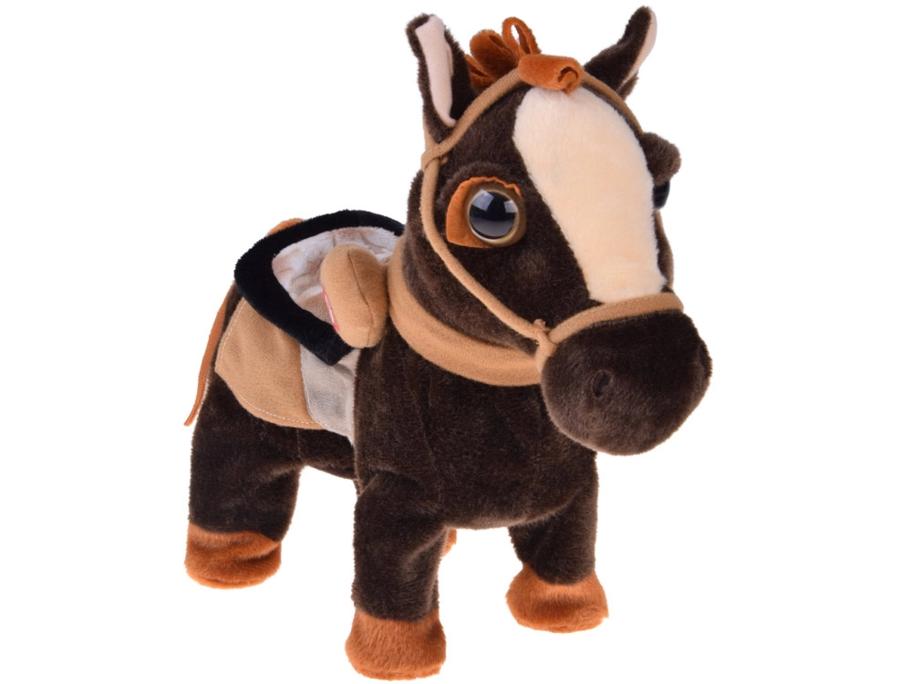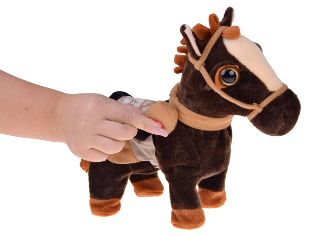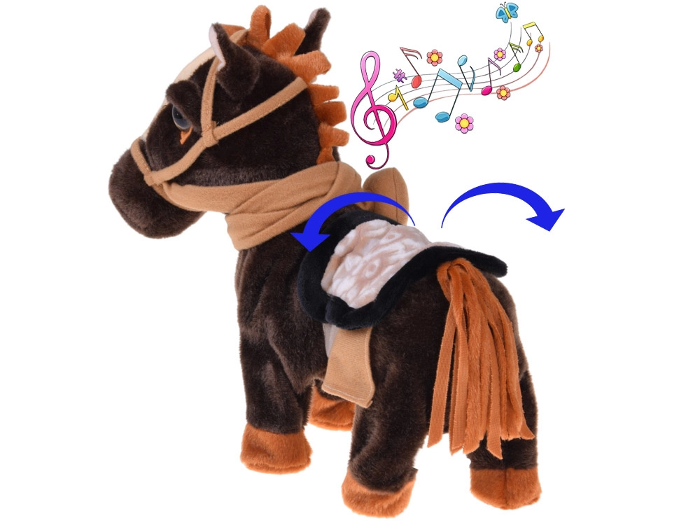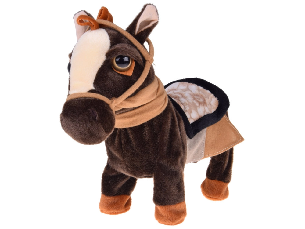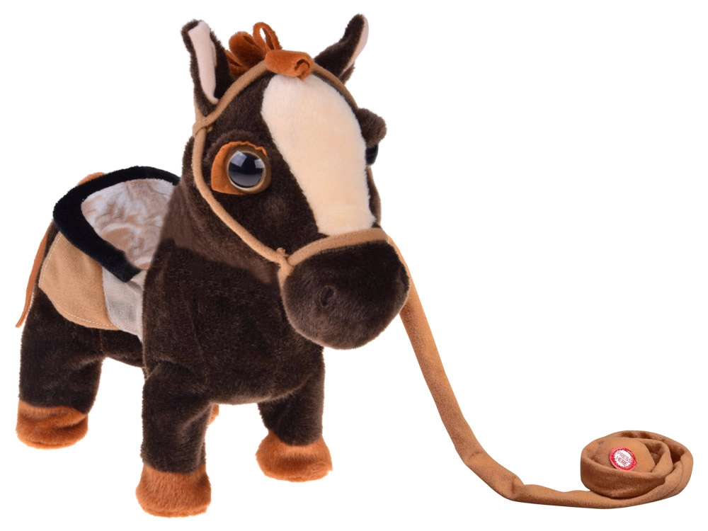 Fedezd fel a western kalandok varázsát ezzel az interaktív plüss pónival, amely a gomb megnyomása után elindul, nyerít, és vidám tánckoreográfiába kezd a vidám country dallamra. A gyerekek imádni fogják a nagy, hímzett szemeket, a selymes szőrt és a longe/póráz segítségével való vezetés lehetőségét.