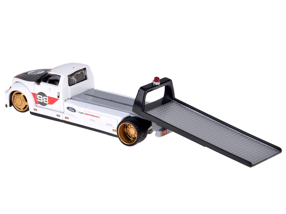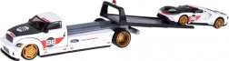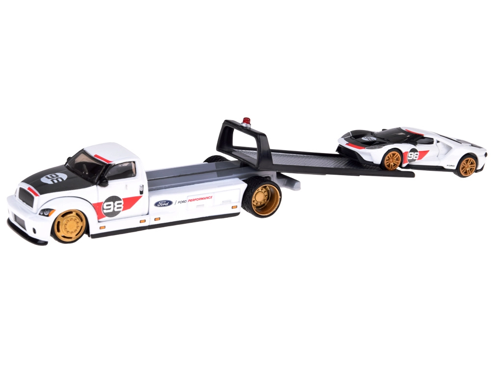 Stílusos gyűjtői készlet 1:64 méretarányban, amely egy fém csúszóplatós trélerből és egy részletgazdag FORD GT Heritage 2021 sportautóból áll. Elegáns fehér színben versenydekorral és szabadon forgó kerekekkel remek látvány a vitrinedben, és szórakoztató játék a fel- és lerakodással.