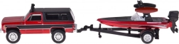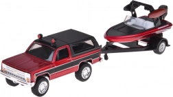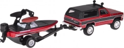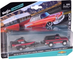 A Maisto licencelt készlete a klasszikus CHEVROLET K5 BLAZER 1979 piros–fekete kivitelét kombinálja utánfutóval és elegáns motorcsónakkal. A fém karosszéria, a pontos arányok és az autentikus külső-belső részletek minden amerikai klasszikus rajongóját lenyűgözik.