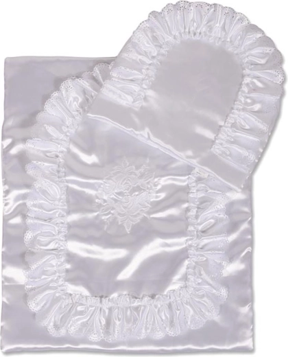 Elegáns, kétdarabos szatén babakocsi szett NEW BABY, amely kényelmet és biztonságot nyújt a kisbabának. Antiallergén töltettel rendelkezik, finom szatén felülettel és 100% pamut alsó anyaggal a gyengéd bőrkontaktusért. Gombok és műanyag vagy fém alkatrészek nélkül a maximális biztonság érdekében.