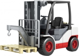 Fedezze fel a részletgazdag 1:12-es targoncát, amely hűen utánozza az ipari gépeket. A fehér, piros és szürke színkombináció, a markáns mintázatú gumiabroncsok és a valósághű villák raklappal vonzó játékká és gyűjtői darabbá teszik.