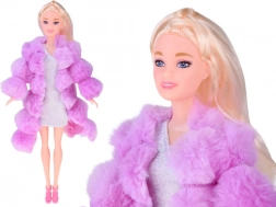 Hosszú szőke hajú, csillogó ruhás és puha rózsaszín/lila bundás baba, amely eleganciát és kreativitást visz a játékba.