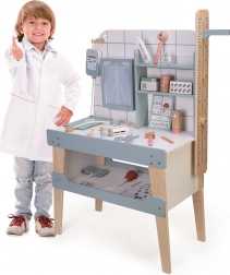 - Teljes klinika otthon – vizsgálóasztal polcokkal, betegkártyák, szemvizsgáló tábla, gyógyszerkártyák és további kiegészítők.