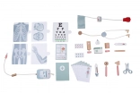 Sztetoszkóp, vérnyomásmérő, lázmérő, otoszkóp, fecskendő, kalapács, olló, csipesz, infúzió, betegkártyák, szemvizsgáló tábla, gyógyszerkártyák és további kiegészítők a teljes körű játékhoz.