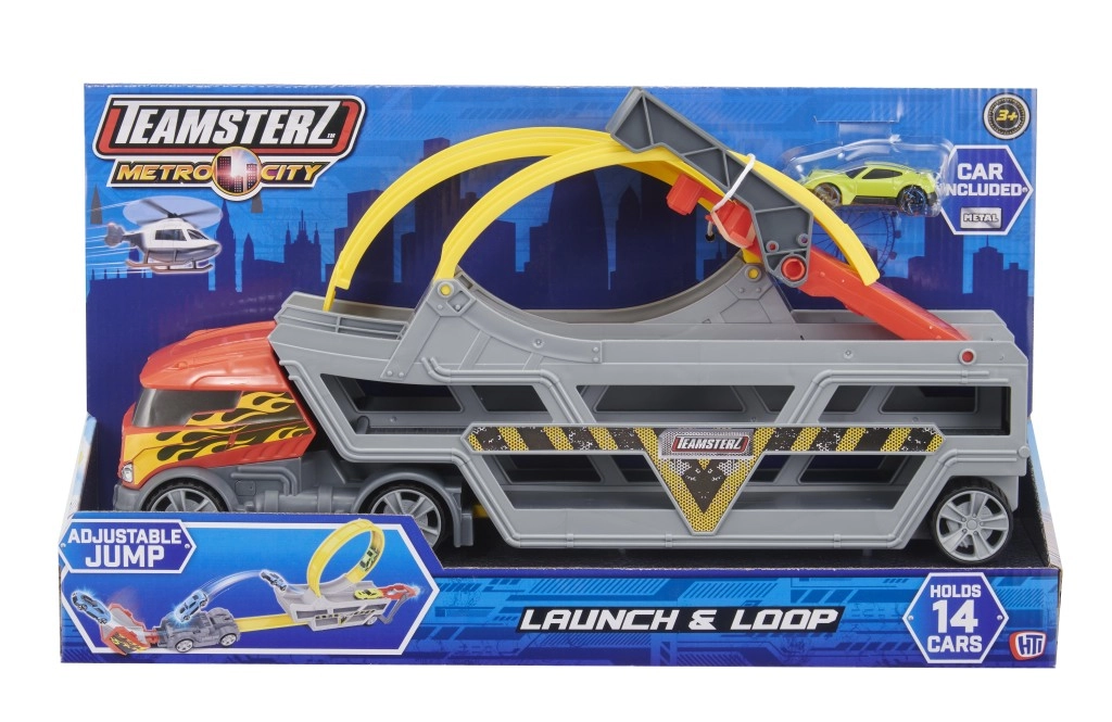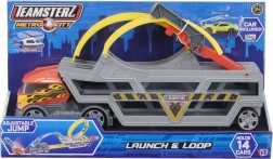 Változtasson minden utat akcióvá! A TEAMSTERZ szállító nemcsak a kisautók szállítására szolgál, hanem teljesértékű versenypályaként is. A felső részen található egy könnyen kihajtható sárga looping és egy rámpa izgalmas ugrásokhoz. A felhúzható kilövővel maximális sebességgel küldheti át a kisautót a hurkon.