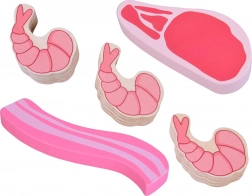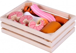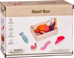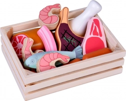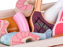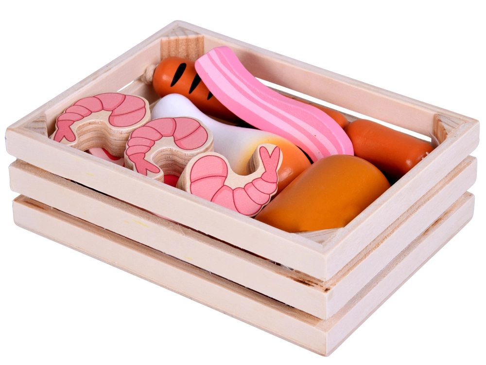 Színes faételek készlete húsokkal és tengeri herkentyűkkel egy praktikus ládikában, amely örömet szerez a kis szakácsoknak és boltosoknak. Kínálja az erős, tartós fa kialakítást, a nem mérgező festékeket és a sima, biztonságos felületeket. Tökéletes a szerepjátékhoz, a finommotorika, a fantázia és a szókincs fejlesztéséhez.