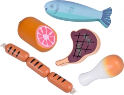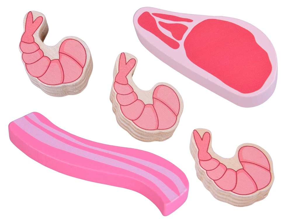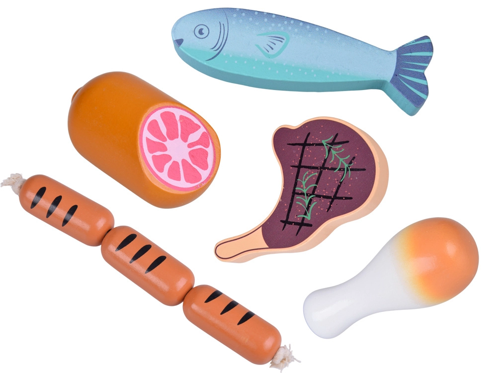 Ez a fa ételek készlet mindent tartalmaz, amit a gyerekek a konyhából vagy a boltból ismernek: virsli, szalámi, szalonna, steakek, csirkehús, hal és garnéla. Az elemek masszívak, kellemesen lekerekítettek és részletgazdagon festettek, hogy realisztikus hatást keltsenek, miközben teljesen biztonságosak a játékhoz.