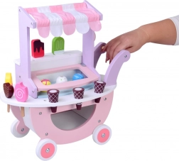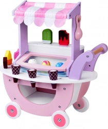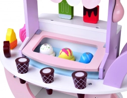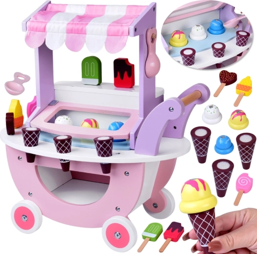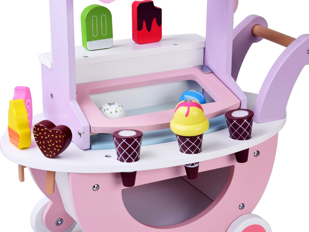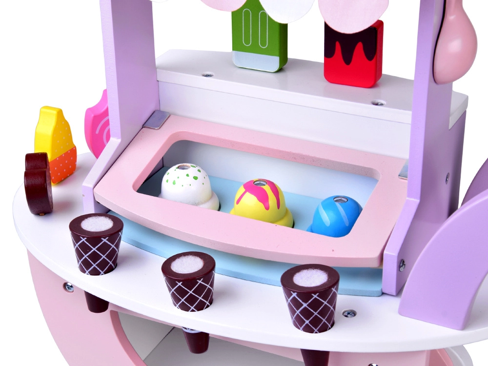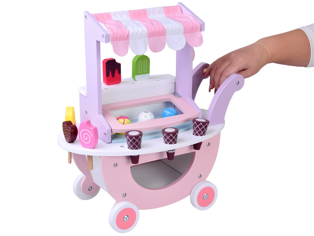 A stand felnyitható fedéllel és belső rekesszel rendelkezik a kiegészítők tárolására, díszes csíkos napellenzővel és erős fogantyúval toláshoz vagy húzáshoz. A kerekeknek köszönhetően a gyerekek bárhol megnyithatják mobil fagyizójukat – a gyerekszobában, a folyosón vagy akár az óvodában.