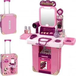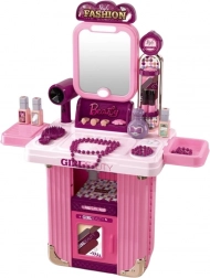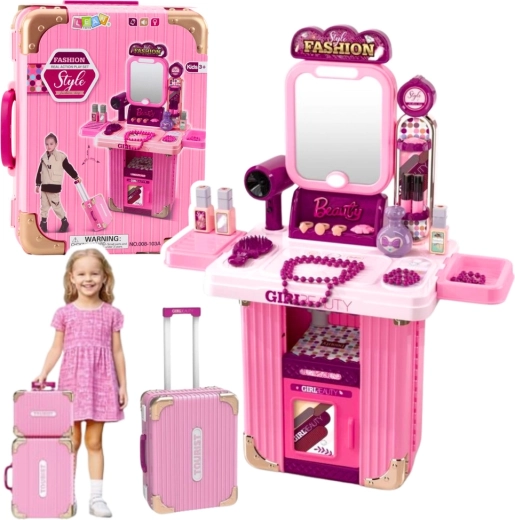 Stílusos, 2 az 1-ben gyermek toalettasztal praktikus bőröndben, amely szétnyitva varázslatos kozmetikai asztallá alakul. Kínál világított tükröt, hangeffekteket és gazdag kellékeket a szépségszalonos szerepjátékhoz. Könnyű és mobil a kerekeknek és kihúzható fogantyúnak köszönhetően, biztonságos anyagokból készült – fejleszti a kreativitást, a képzeletet és a finommotorikát.