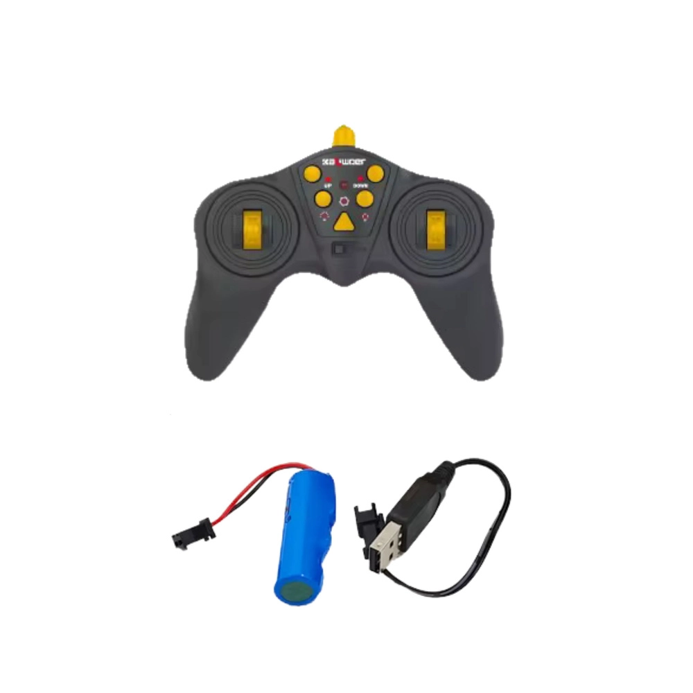 A csomagban két joystickos távirányítót, 3,7 V-os újratölthető akkumulátort és USB kábelt találsz – csak tegyél AA elemeket a távirányítóba, és indulhat a móka.