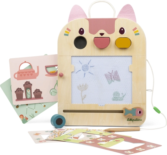 Fedezd fel a varázslatos rajztáblát Jeanne cicával a Lilliputiens-től, amely 18 hónapos kortól végtelen rajzolási lehetőségeket és játékot kínál. A csomag tartalma: 3 bélyegző formákkal, 6 kétoldalas foglalkoztató kártya és egy zsinóron lévő fa ceruza. A rajzokat egyszerűen gyorsan letörölheted, és kezdheted elölről – ideális a finommotorika és az érzékelés fejlesztéséhez.