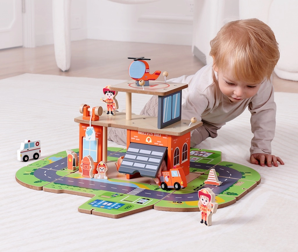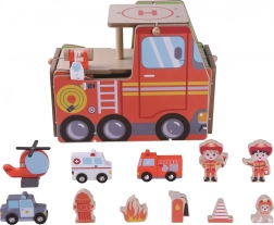 A játék minőségi fából és fém elemekből készült a nagyobb tartósságért. 13 színes elemet tartalmaz, köztük tűzoltó figurákat, járműveket, kiegészítőket és mentőfelszerelést. 3 éves kortól ajánlott, fejleszti a finommotorikát, a szem–kéz koordinációt és a csapatmunkát.