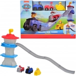 A domináns torony piros tetővel és szürke rámpával lehetővé teszi a járművek magasból való elindítását, dinamikus versenyeket és mentőakciókat teremtve.
