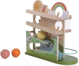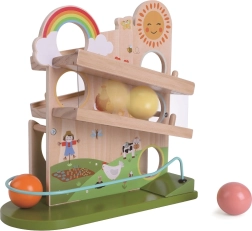 Ez a kreatív golyópálya friss, falusi dizájnjával minden játékot színes kalanddá varázsol. A gyerekek figyelik, ahogy a golyók különböző dőlésszögű pályákon elindulnak, nyílásokban eltűnnek, majd újra felbukkannak – mindezt vidám nap-, szivárvány- és állatillusztrációk kíséretében. A stabil alap és a gondosan megmunkált fa elemek a legkisebbek számára is biztonságos kezelhetőséget biztosítanak.