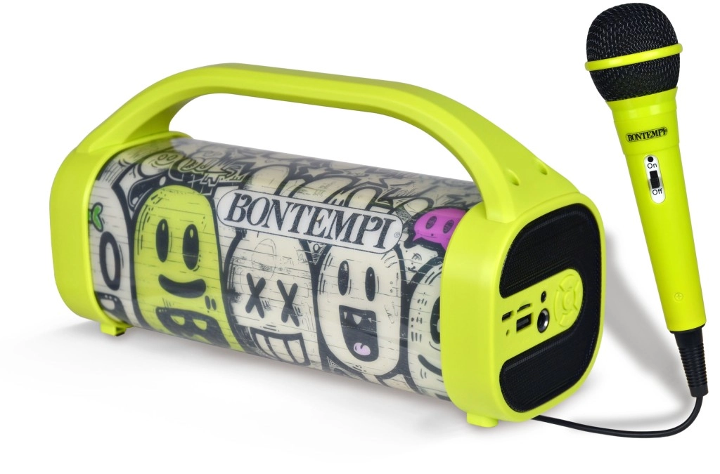 Szórakoztató vezeték nélküli hangszóró dinamikus mikrofonnal karaokehoz, bulikhoz és gyerekzsúrokhoz. Kínál Bluetooth csatlakozást, tiszta és erőteljes hangzást, színes fényhatásokat a megfelelő hangulathoz, és kompakt, hordozható – ideális utazáshoz és otthonra is.