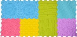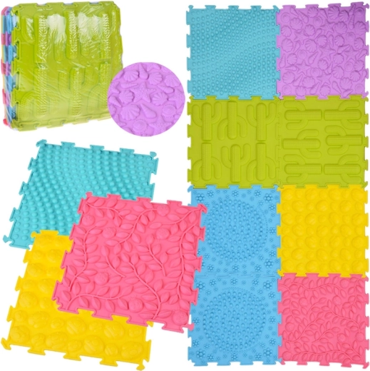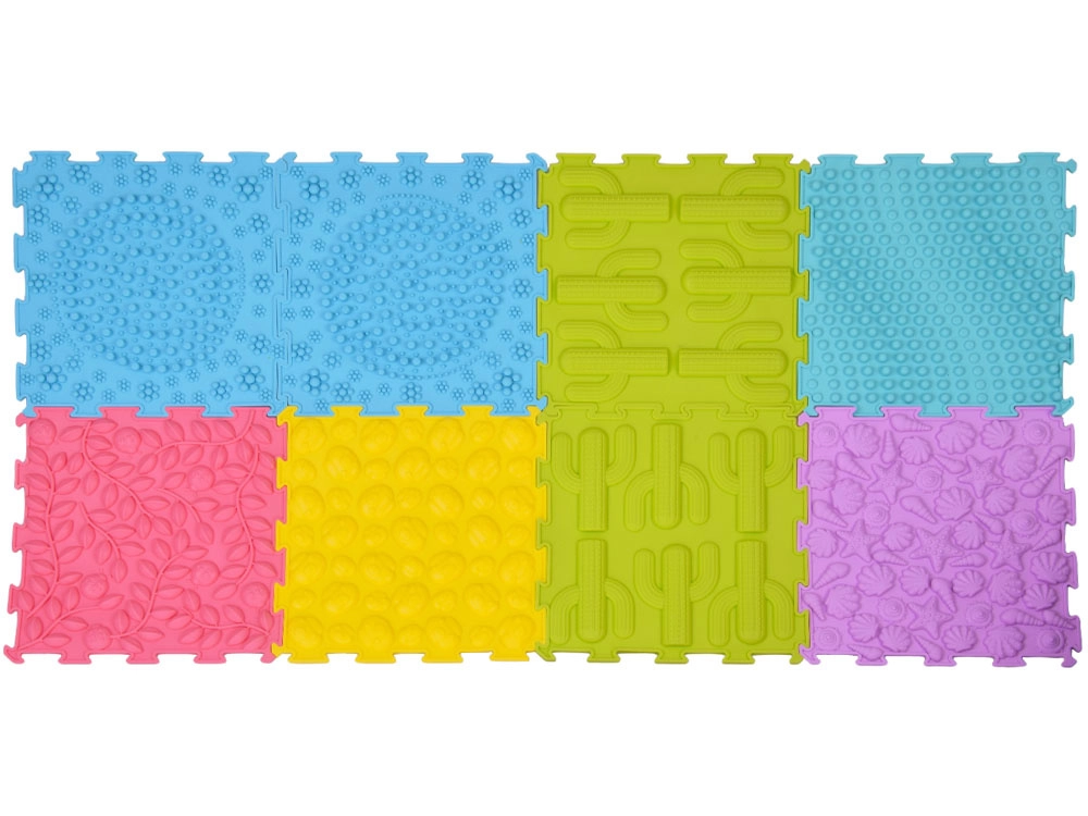 A szenzoros alátét nyolc összekapcsolható elemből áll (24,5 × 24,5 cm, vastagság kb. 1 cm), változatos textúrákkal – kaktuszok, levelek katicákkal, kagylók, virágok, valamint különféle kupolák és pöttyök. Az egyes elemek tetszés szerint kombinálhatók és elrendezhetők téglalappá, sávvá vagy közel négyzetté, így a felület könnyen igazítható a térhez és az aktivitáshoz.