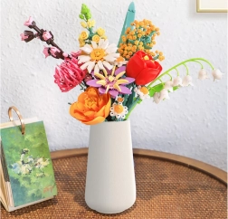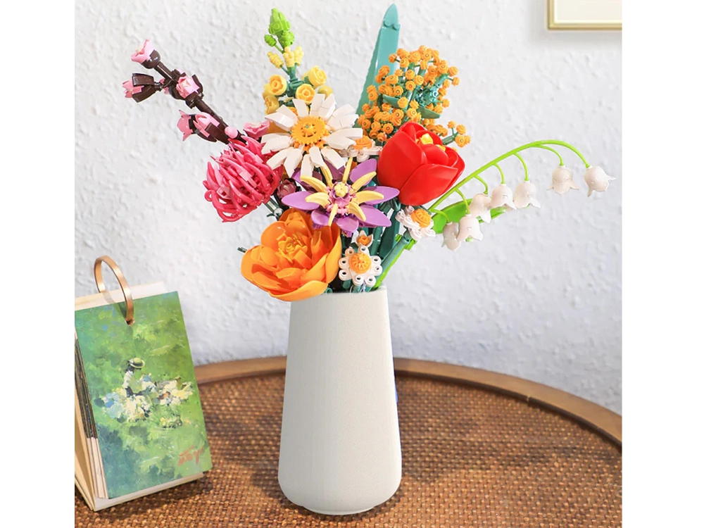 Ez a dizájnkészlet ötvözi a kreatív építést a modern lakásdekorációval. A csomagban mindent megtalál, ami egy színes virágcsokor összeállításához szükséges – az apró százszorszépegtől a feltűnő krizantémokig, mindezt egy matt kerámia vázával kiegészítve, amely stabilitást és tiszta megjelenést biztosít a kompozíciónak.