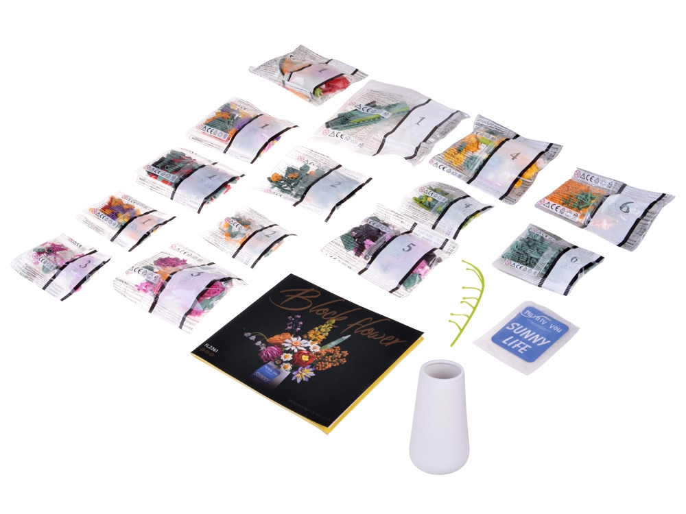 A készlet számozott tasakokra van bontva és lépésről lépésre haladó képes útmutatóval egészül ki, így gyakorlott és kezdő építőknek egyaránt ideális. A kész csokor kb. 30 cm magas, kiválóan mutat asztalon, polcon vagy komódon, és órákon át tartó pihentető, kreatív szórakozást nyújt.