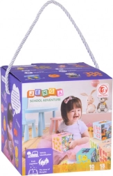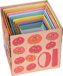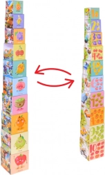Szórakoztató és okos játék a kis felfedezőknek: 10 színes kartonkockából álló készlet tornyok építéséhez és egymásba helyezéshez. A gyümölcsöket és az 1–10-ig terjedő számokat, közlekedési eszközöket és szakmákat bemutató állatkákat ábrázoló illusztrációk fejlesztik a szókincset, a logikát és a finommotorikát. Tartós kivitel minőségi, kemény kartonból, és könnyű tárolás egymásba rakható kialakítással.