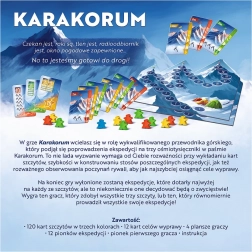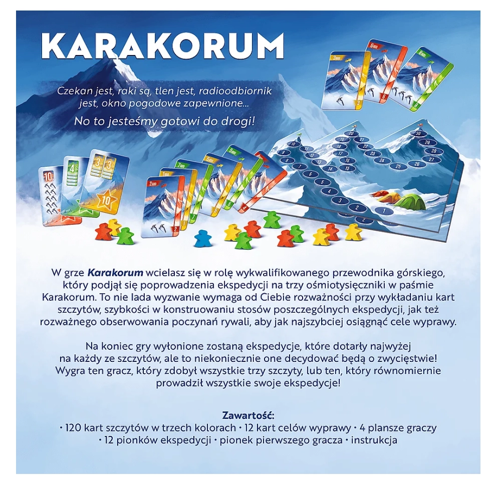 Válj a hegyek királyává a hangulatos KARAKORUM: King of the Mountains játékban. Expedícióvezetőként a megfelelő pillanatban játszod ki a csúcskártyákat, gondosan építed az egyes küldetések paklijait, és alkalmazkodsz az ellenfelek tempóváltásaihoz. Minden döntés csapatodat a cél felé viszi – meghódítani három legendás nyolcezrest.