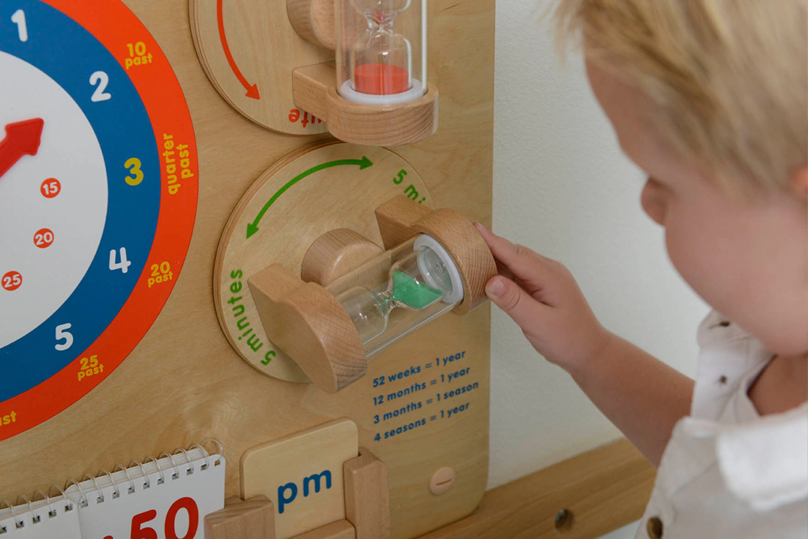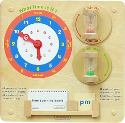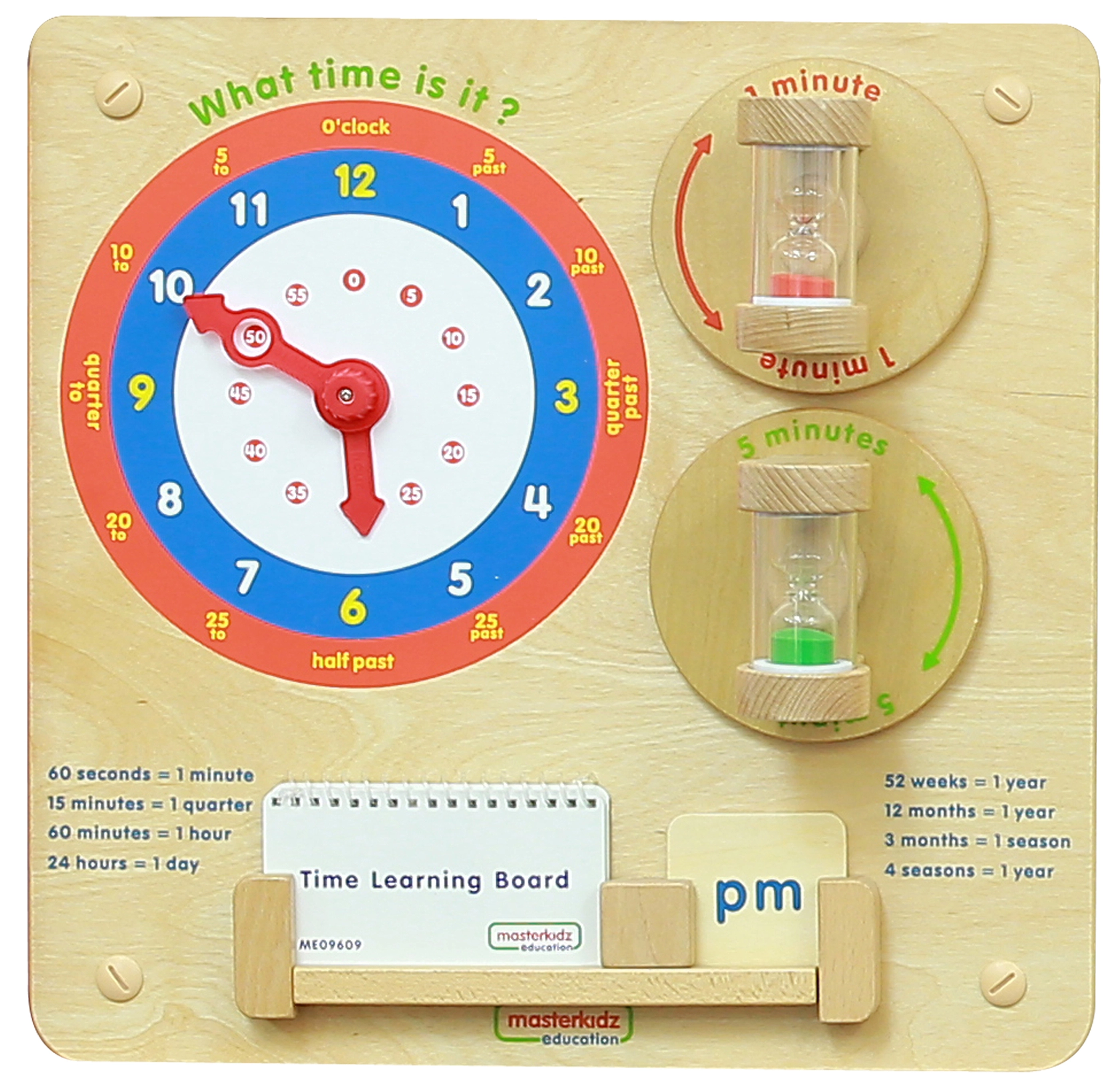 MASTERKIDZ fa oktatótábla megtanítja a gyerekeket az idő leolvasására a hagyományos óráról, megérteni perceket, órákat és napokat, valamint érzékelni az időtartamot két homokóra (1 és 5 perc) segítségével. A falra vagy a Masterkidz Flex rendszerbe szerelhető, tartós kivitel, mozgatható mutatók és áttekinthető feliratok támogatják a logikus gondolkodást, a finommotorikát és az önálló játékot.