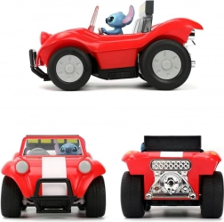Piros karosszéria fehér csíkkal, nagy, mély mintázatú kerekek és beépített STITCH figura a még nagyobb mókáért.