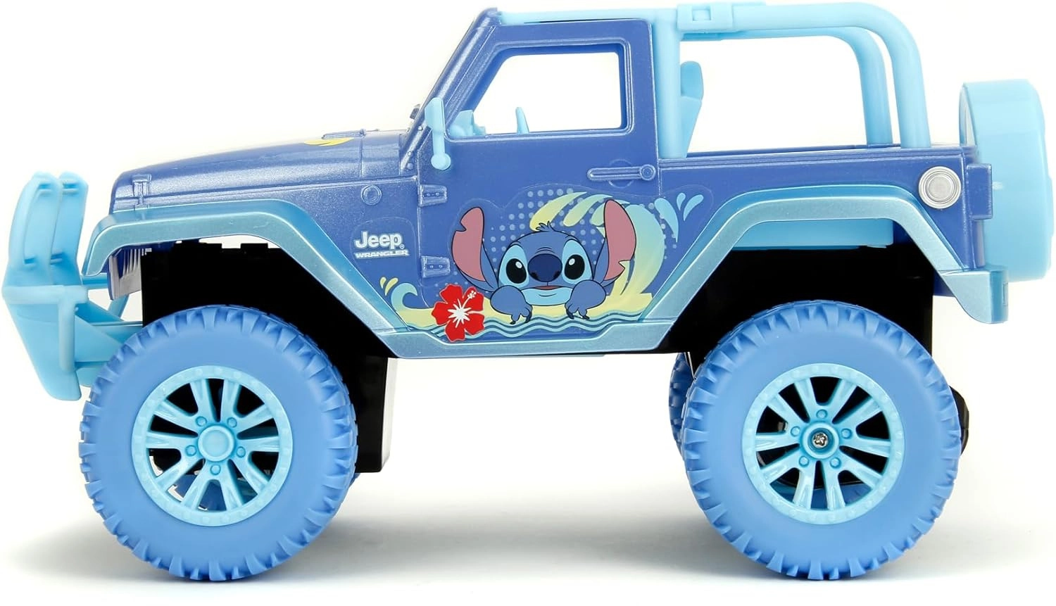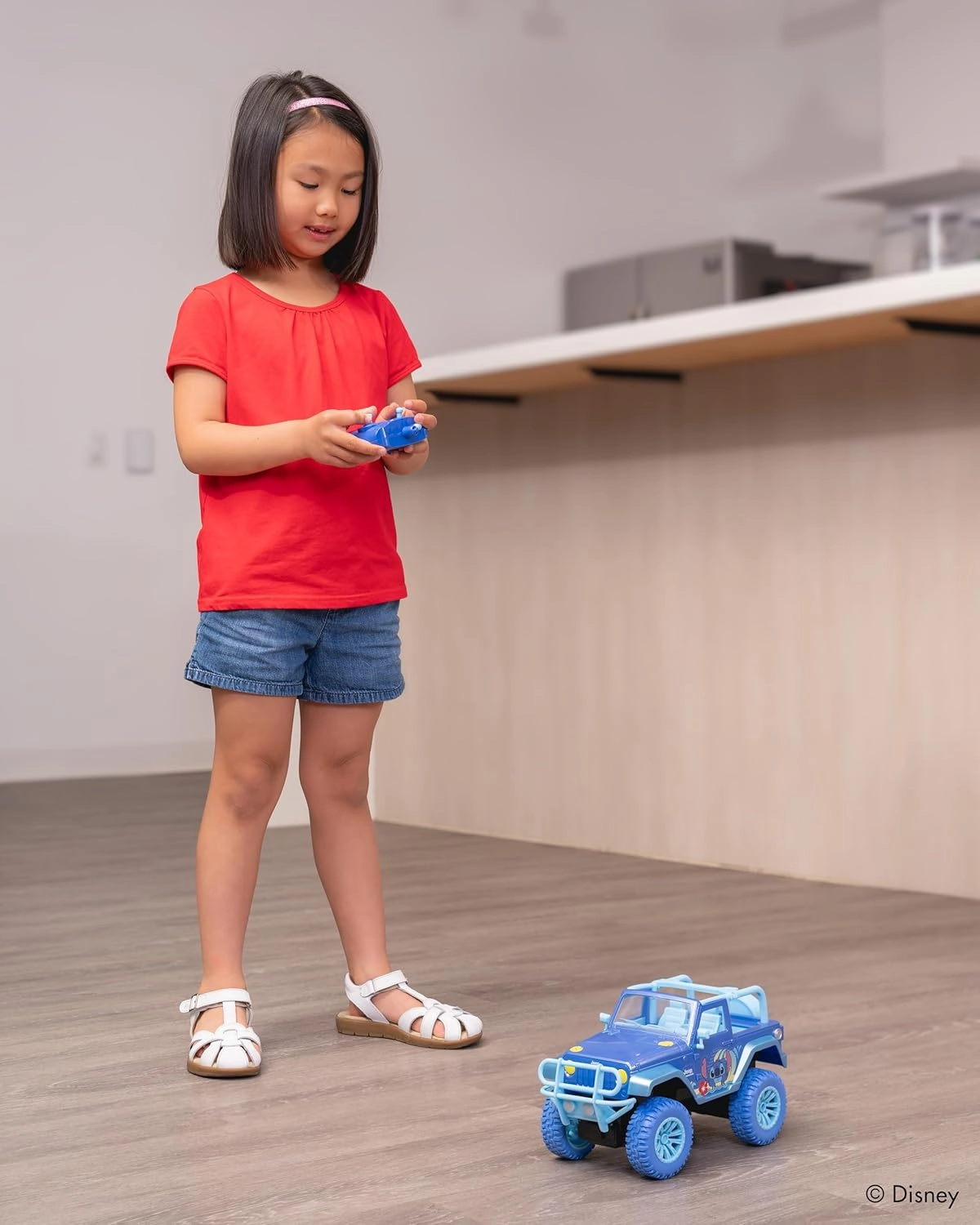 A stílusos Jeep Wrangler Stitch RC modell ötvözi a legendás Jeep klasszikus megjelenését a DISNEY vidám világával. Az intenzív türkizkék karosszéria, a STITCH motívumok és a masszív alváz vonzó off‑road külsőt kölcsönöznek az autónak. A nagy, mély mintázatú kerekek biztos tapadást adnak az otthoni, sima felületeken.