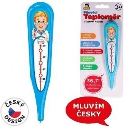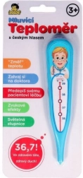Fény skála segít megérteni, hogy a plüss milyen állapotban van, és a magyar hang tanácsot ad, mit tegyünk, csak meg kell nyomni a hőmérő hegyét. A hőmérő műanyagból készült, kék-fehér színű, és vidám orvos motívumot visel. Fejleszti a legkisebbek fantáziáját és kreativitását, akik így az állatkákkal, testvérekkel vagy barátokkal doktort játszhatnak.