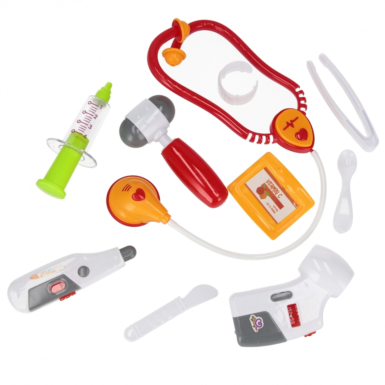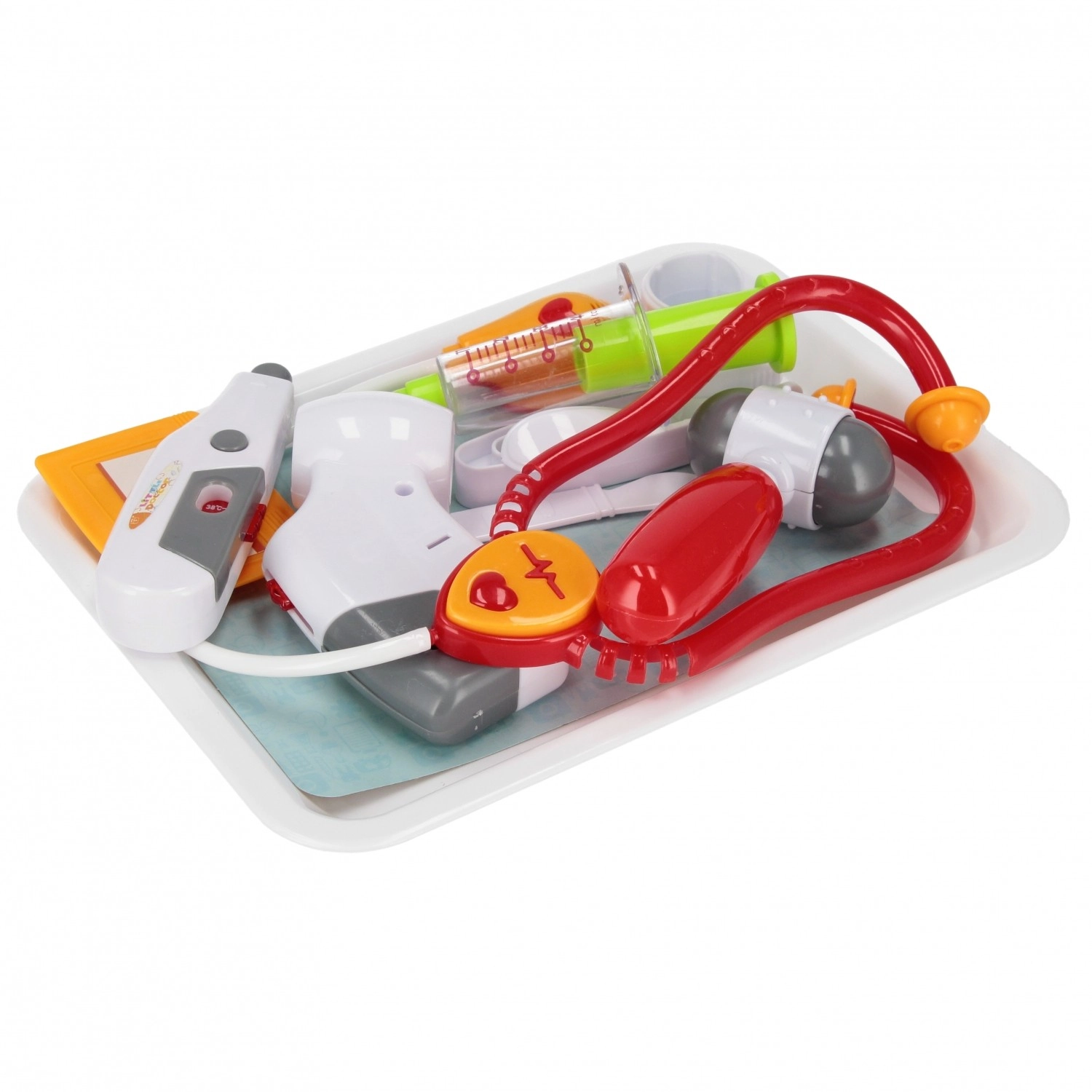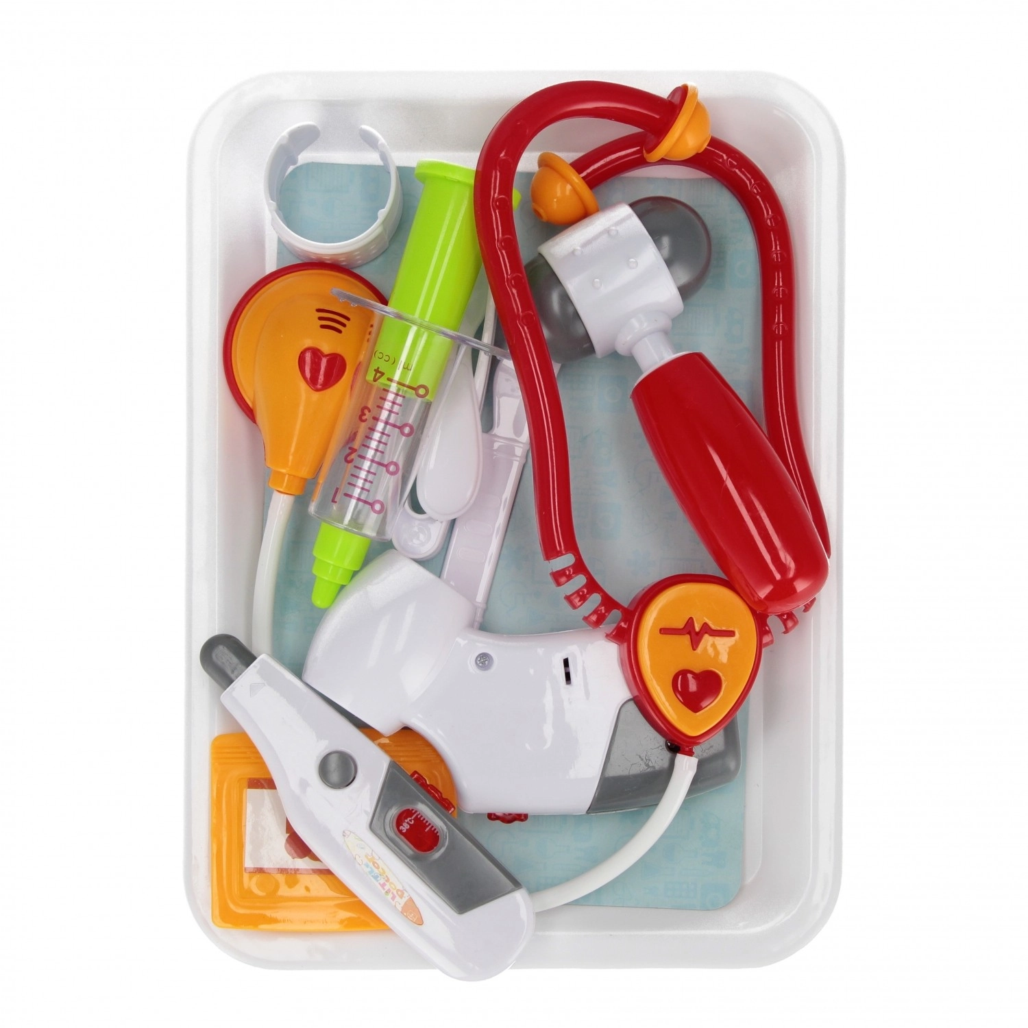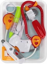 A csomag tartalma: tálca, sztetoszkóp, fecskendő, csipesz, ragtapasz, kés, kanál, reflexkalapács, pulzoximéter, hőmérő és azonosítókártya. Ideális testvéreknek és barátoknak közös játékra, valamint az első ismerkedéshez az orvosi környezettel biztonságos utánzó játék formájában.