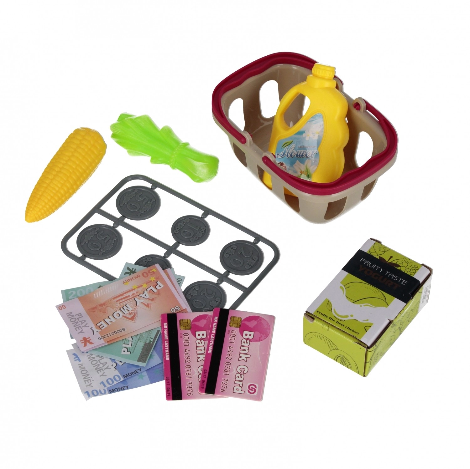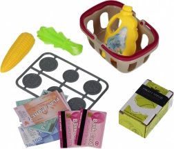 A készlet műanyag élelmiszereket, kosarat, játékbankjegyeket és érméket tartalmaz – mindent, ami a teljes értékű boltos játékhoz szükséges.