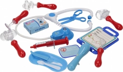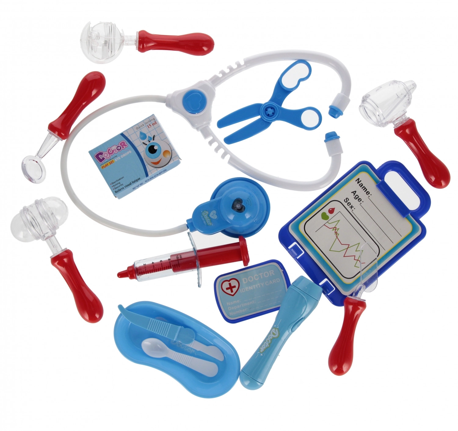 A készlet mindent tartalmaz az alapvizsgálathoz: sztetoszkóp, injekciós fecskendő, karton „gyógyszerek”, zseblámpa, laringológiai eszközök, eszköztartó doboz, pácienskártya és olló. A 40 × 29 cm-es méretnek köszönhetően a szett könnyen hordozható, mégis bőséges tartalmú.
