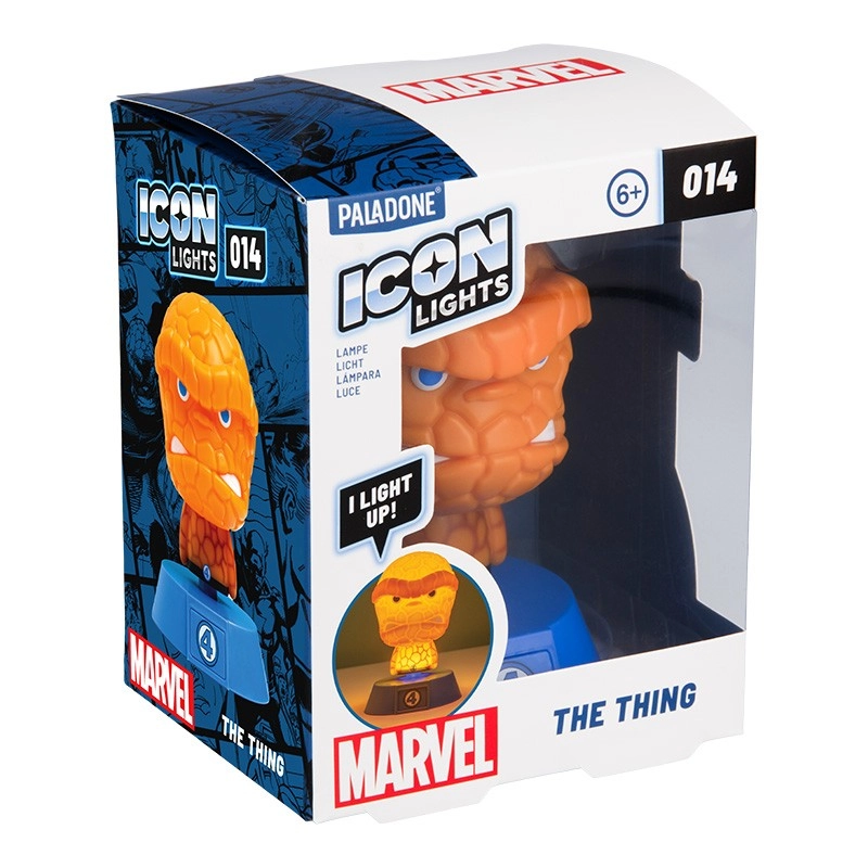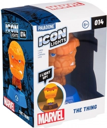Stílusos Icon Light éjjeli lámpa Fantasztikus Négyes – The Thing motívummal, amely finom, hangulatvilágítást és bájos dizájnt visz minden helyiségbe. Tökéletes éjjeliszekrényre, polcra vagy íróasztalra, és ideális eredeti ajándék a rajongóknak képregényes ikonok kedvelőinek. Tápellátás: 2× AAA elem (nem tartozék).