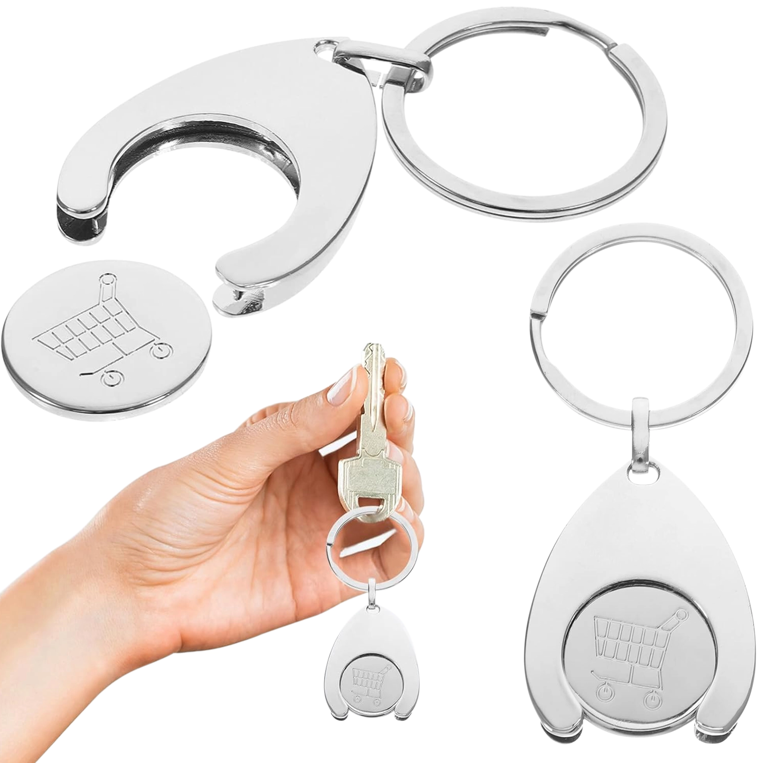Okos 2 az 1-ben megoldás: elegáns fém kulcstartó kivehető zsetonnal a bevásárlókocsi kioldásához. A masszív karikának köszönhetően könnyen a kulcsokra, táskára vagy hátizsákra erősíthető, és gyors hozzáférést biztosít a kocsihoz apró nélkül.